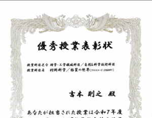 吉本先生が担当する「材料科学/物質の世界」の授業が優秀授業として表彰されました。藤崎さんの講演も実施されており、その内容が学生から高く評価されたことも受賞の一因となりました。
